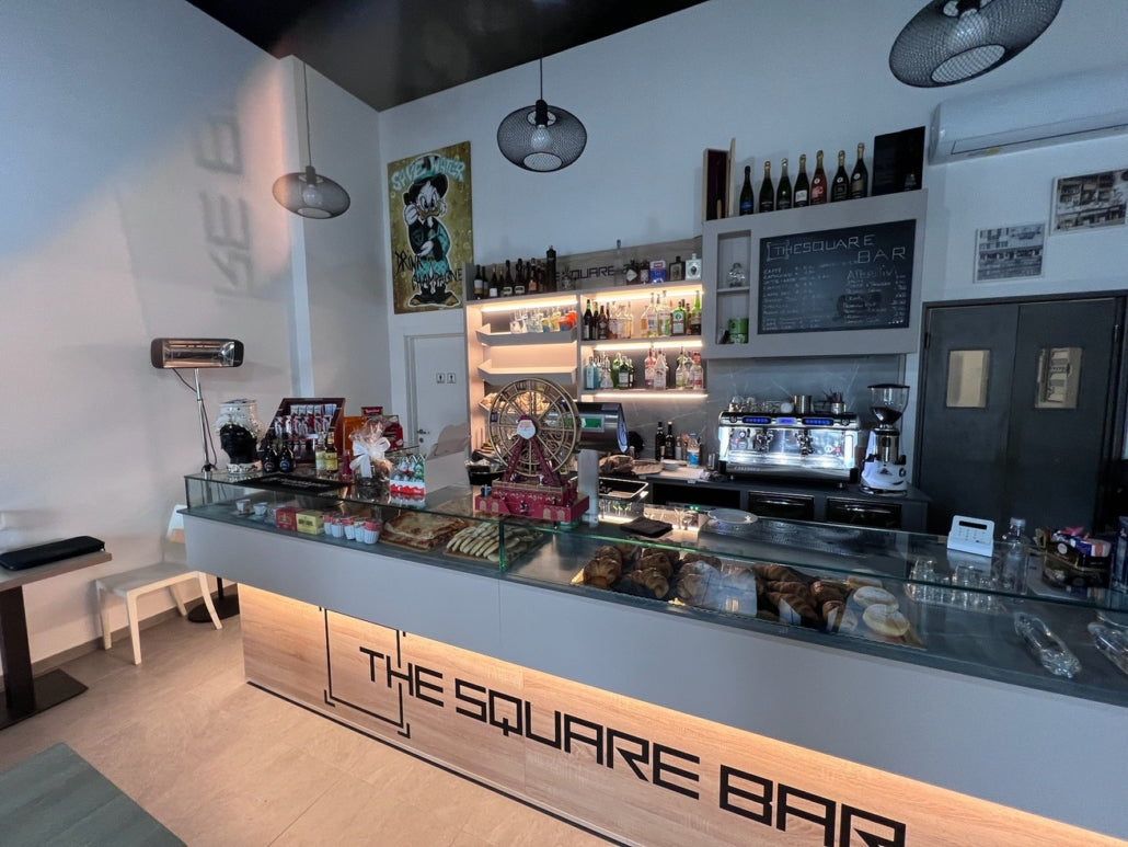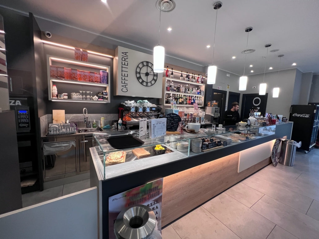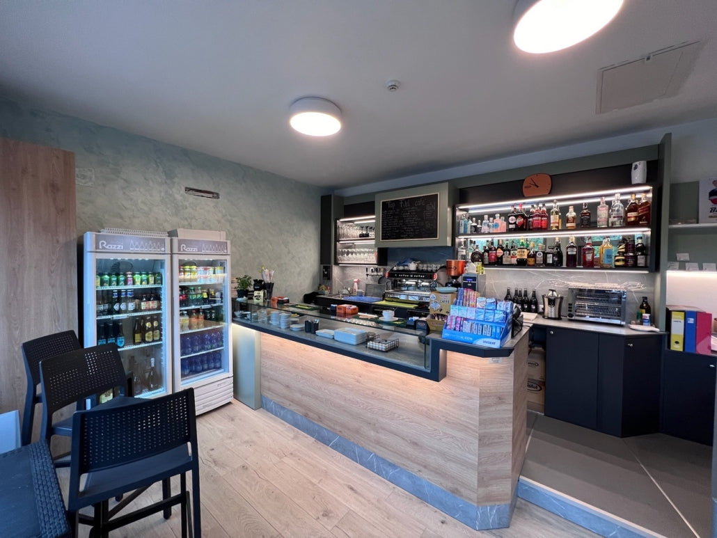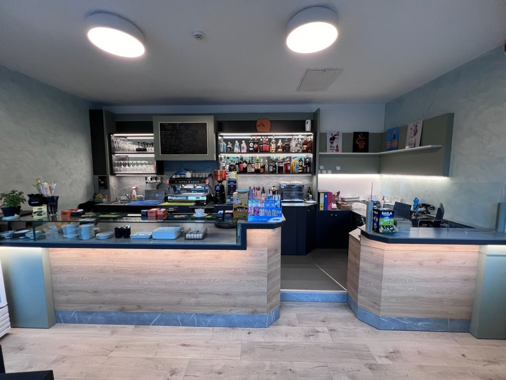 Un comptoir sur mesure associant stratifié effet bois, blanc mat et gris mat, avec un plan client en verre extra-clair. Entièrement équipé, il intègre cellules réfrigérées, vitrine froide encastrée, zone café avec bac à marc et trémie, ainsi qu’un arrière-bar sublimé par des étagères LED.