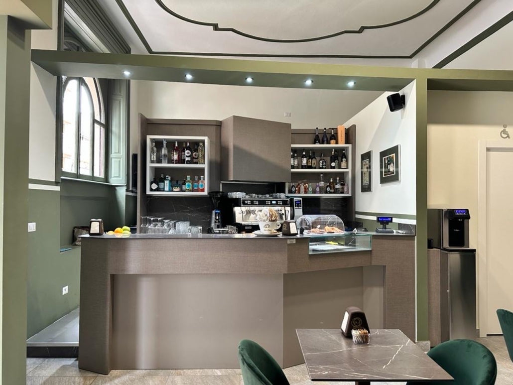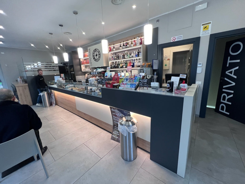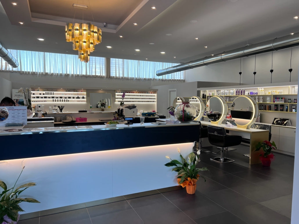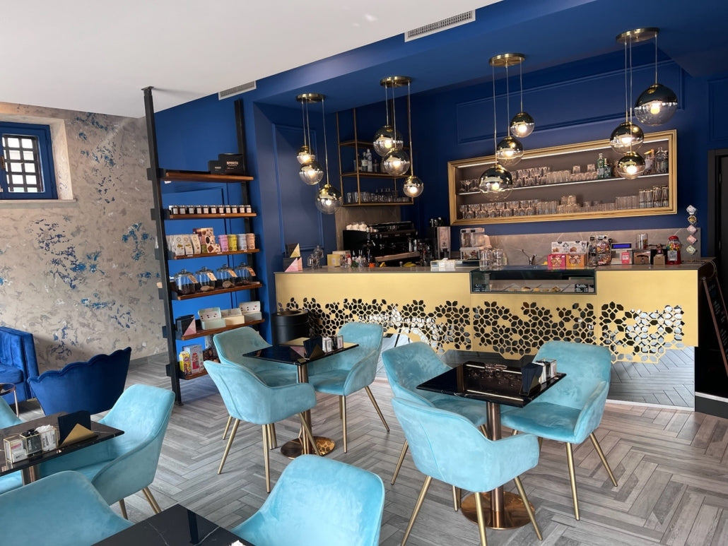 Un comptoir sur mesure associant stratifié effet bois, blanc mat et gris mat, avec un plan client en verre extra-clair. Entièrement équipé, il intègre cellules réfrigérées, vitrine froide encastrée, zone café avec bac à marc et trémie, ainsi qu’un arrière-bar sublimé par des étagères LED.